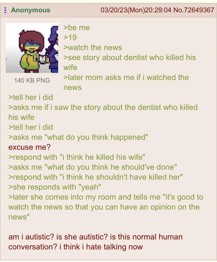 Delete Sensitive seacliff Mar 21, 2023 at 10:08PM EDT -Be Autistic. -People around you is trying to make a frivolous conversation out of anything. -Awkward AF because they have little to nothing to add to a topic. -But you're the weird one for not wanting to participate in these conversations. +93 Reply