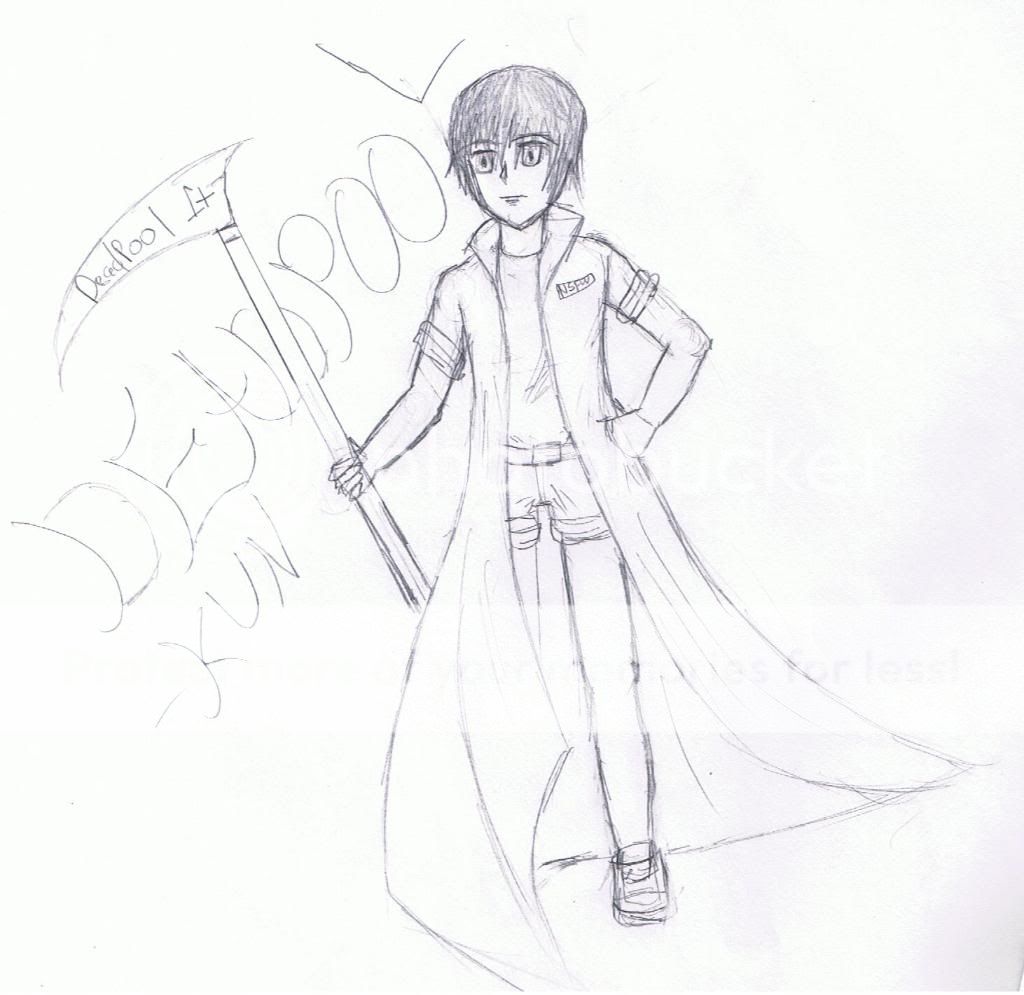 This is just a rough quick sketch of Deadpool-kun I did in a couple of minutes coz I was bored. I didn't know how to draw his hair when his head was tilted back so this was the end result. I don't really like it but it's accurate-ish.