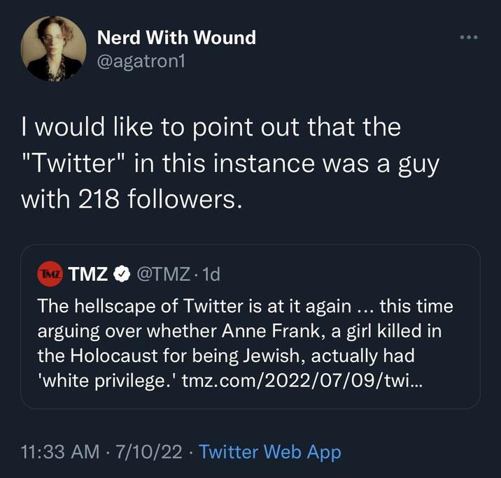 I have a bigger issue with how people seem to treat "Twitter" as a monolith. Someone sees a few people with questionable ideas, maybe even them just talking as a thought experiment or a joke, and then people suddenly act like all of Twitter thinks this: