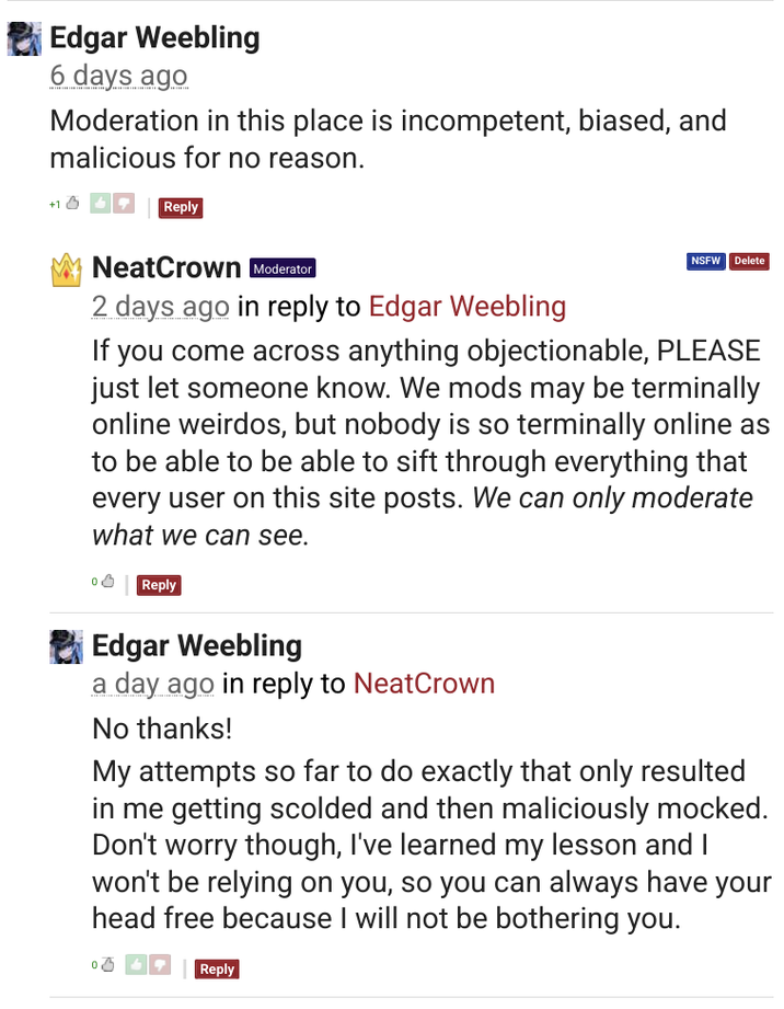 Also made this deleted wall vent post where they seemed to wallow in "how bad things were" but refused to do anything that might actually help anything