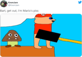 On November 6th, 2020, Twitter[5] user KremJam tweeted another reference to the comic but with an MS Paint drawing of Mario peeing off a cliff with a goomba watching behind him under the caption "Bart, get out, I'm Mario's piss" (shown below).