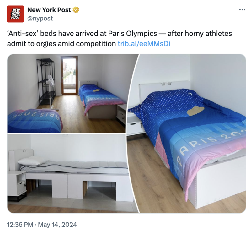 On May 14th, 2024, the New York Post reported that the so-called Anti-sex beds that debuted at the 2021 Tokyo Olympics would return. However, it has been proven the beds are not designed to dissuade athletes from having sex, and are instead designed with sustainability in mind.