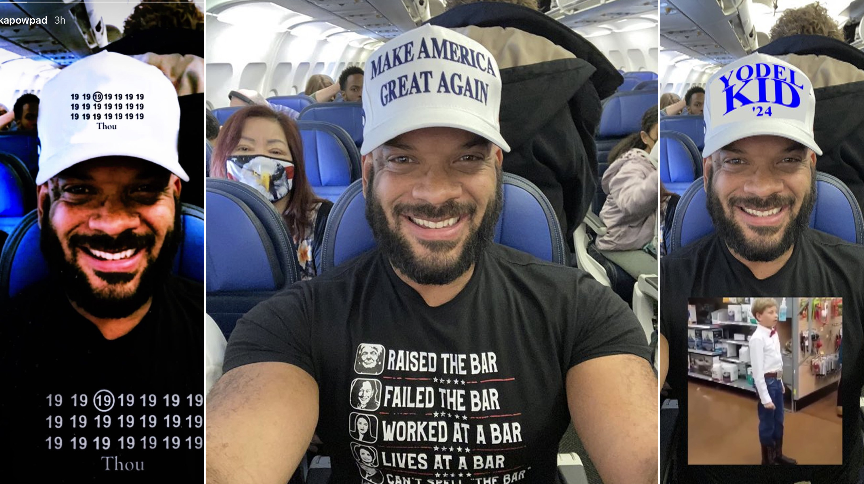 David Harris Jr. is a conservative influencer who has a clothing line with pro-MAGA, pro-Trump clothing. Multiple times, he has filmed himself on planes wearing overtly pro-MAGA clothing. For example, he did so on June 30th, 2021, and the video he posted to Twitter[1] / X gained over 1,900 retweets and 14,000 likes in three years (shown below).
